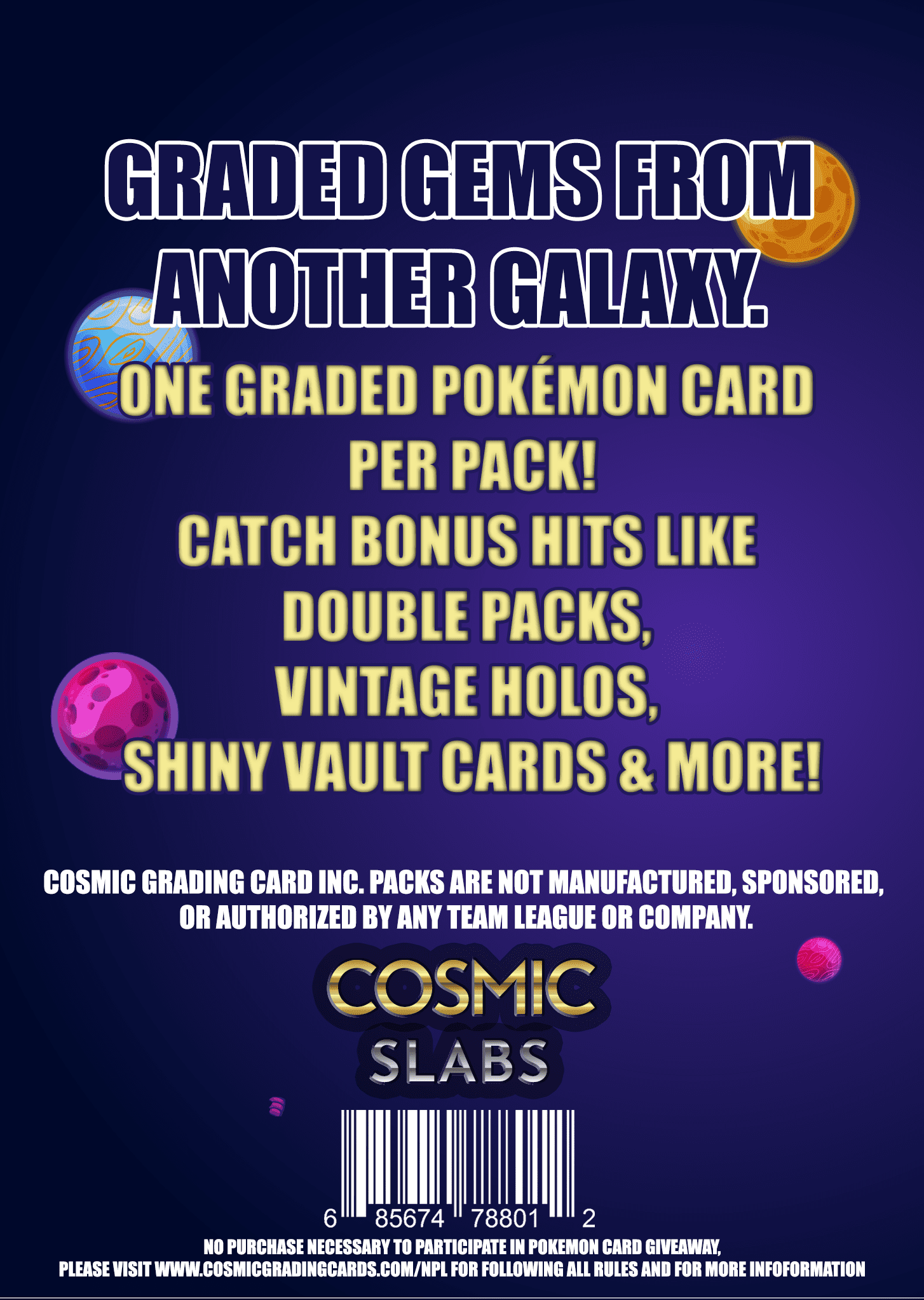 Catch the excitement with the Cosmic Slabs: Pokémon Mystery Pack — the ultimate surprise for collectors and fans! Each pack contains 1 professionally graded Pokémon card, sealed in a slab and ready to display. Whether you’re chasing nostalgic vintage classics or powerful modern hits, this mystery box offers something special every time.